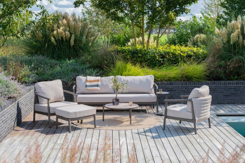 | Kurze Beschreibung | Das Barolo Loungeset in Terre-Farbe mit Hocker bietet eine komfortable und stilvolle Einrichtung für Garten oder Terrasse. Dieses komplette Set besteht aus einer 3-Sitzer-Bank, zwei separaten Stühlen und einem praktischen Hocker, alle ausgestattet mit weichen, unterstützenden Kissen, die zum Entspannen in der Sonne einladen. Hergestellt aus wetterfesten Materialien, kann das Set problemlos den gesamten Sommer über im Freien stehen und ist beständig gegen Regen, Sonne und Temperaturschwankungen. Das pflegeleichte Design erleichtert die Reinigung, während die warme Terre-Farbe eine sommerliche Atmosphäre schafft. Perfekt für gesellige Momente mit Familie und Freunden kombiniert das Barolo Loungeset Komfort, Langlebigkeit und ein einladendes Erscheinungsbild, wodurch jeder Außenbereich in eine Oase der Entspannung und des Genusses verwandelt wird. |