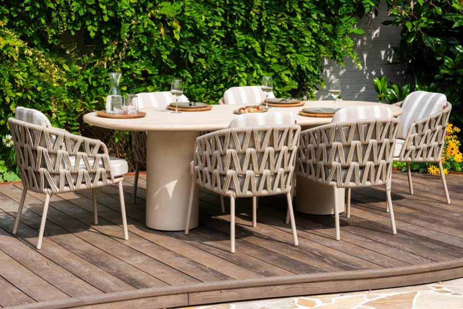 | Kurze Beschreibung | Der Beverly Dining Chair vereint Komfort und Stil für Ihren Außenbereich. Das robuste Gestell aus beschichtetem Aluminium in edlem Latte-Farbton ist mit Rope in einem beige-latte Farbton umhüllt, was dem Stuhl eine warme Ausstrahlung verleiht. Die weich gepolsterten, wetterbeständigen Kissen sorgen für optimalen Sitzkomfort, ideal für lange sommerliche Dinner oder gesellige Momente im Garten. Das dezent abgerundete Design des Stuhls unterstützt eine ergonomische Sitzhaltung und verleiht zugleich eine luxuriöse Optik. Der Beverly Dining Chair lässt sich perfekt mit einem unserer maßgefertigten Tische kombinieren, sodass Sie einen kompletten, einladenden Essbereich im Freien schaffen, bereit für sommerliche Entspannung und geselliges Beisammensein. |
