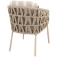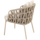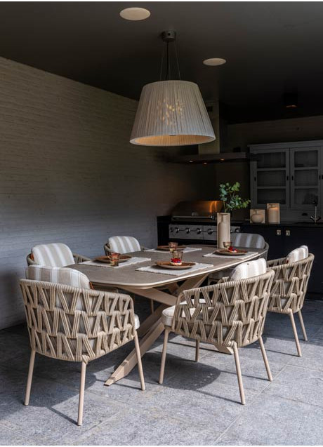 | Der Beverly Dining Chair vereint Komfort und Stil für Ihren Außenbereich. Das robuste Gestell aus beschichtetem Aluminium in edlem Latte-Farbton ist mit Rope in einem beige-latte Farbton umhüllt, was dem Stuhl eine warme Ausstrahlung verleiht. Die weich gepolsterten, wetterbeständigen Kissen sorgen für optimalen Sitzkomfort, ideal für lange sommerliche Dinner oder gesellige Momente im Garten. Das dezent abgerundete Design des Stuhls unterstützt eine ergonomische Sitzhaltung und verleiht zugleich eine luxuriöse Optik. Der Beverly Dining Chair lässt sich perfekt mit einem unserer maßgefertigten Tische kombinieren, sodass Sie einen kompletten, einladenden Essbereich im Freien schaffen, bereit für sommerliche Entspannung und geselliges Beisammensein. | |