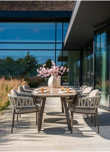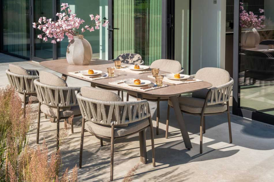 | Kurze Beschreibung | Der Calma Dining Chair in der natürlichen Farbe Terre vereint Ruhe und Stil in Ihrem Außenbereich. Das langlebige Aluminiumgestell ist mit einer hochwertigen Pulverbeschichtung versehen und mit handgeflochtenem Rope umhüllt, was dem Stuhl eine moderne und warme Ausstrahlung verleiht. Die bequemen Kissen aus wetterbeständigem Stoff fühlen sich angenehm weich an und bieten optimalen Sitzkomfort. Durch die ergonomische Form sorgt der Stuhl für eine entspannte Sitzhaltung – perfekt für lange Abendessen in der Sonne. Kombinieren Sie den Calma Dining Chair mit einem unserer maßgefertigten Gartentische und schaffen Sie einen stilvollen Essbereich, in dem Sie die Sommerabende in vollen Zügen genießen können. |