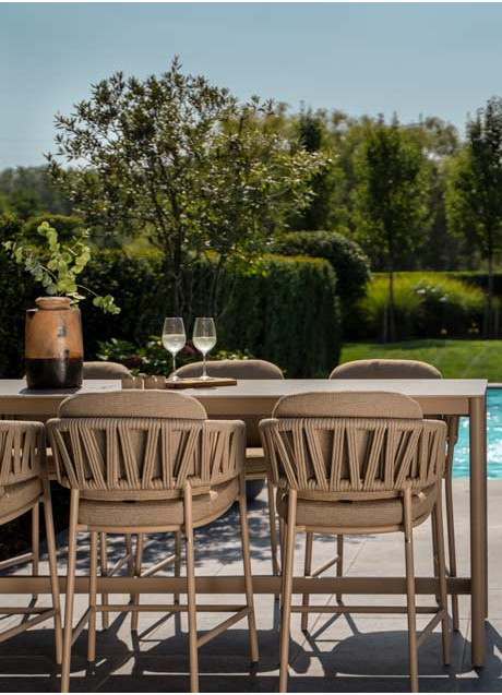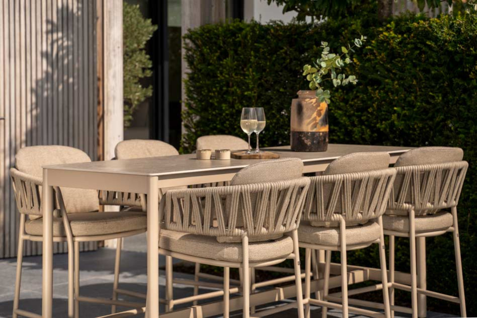| Kurze Beschreibung | Der Calma High Dining Chair in der warmen Farbe Latte vereint modernes Design mit höchstem Outdoor-Komfort. Der leichte, aber stabile Aluminiumrahmen ist mit einer langlebigen Pulverbeschichtung versehen und mit handgeflochtenem Rope in sanften Naturtönen umhüllt. Die bequemen, wetterbeständigen Kissen sorgen für ein herrliches Sitzgefühl, perfekt für lange Sommerabende am Bartisch. Dank der erhöhten Sitzposition genießt du eine entspannte Haltung und einen optimalen Blick über deinen Garten oder deine Terrasse. Kombiniere den Calma High Dining Chair mit einem unserer maßgefertigten Bartische und schaffe einen stilvollen und gemütlichen High-Dining-Bereich für jeden sommerlichen Moment im Freien. |