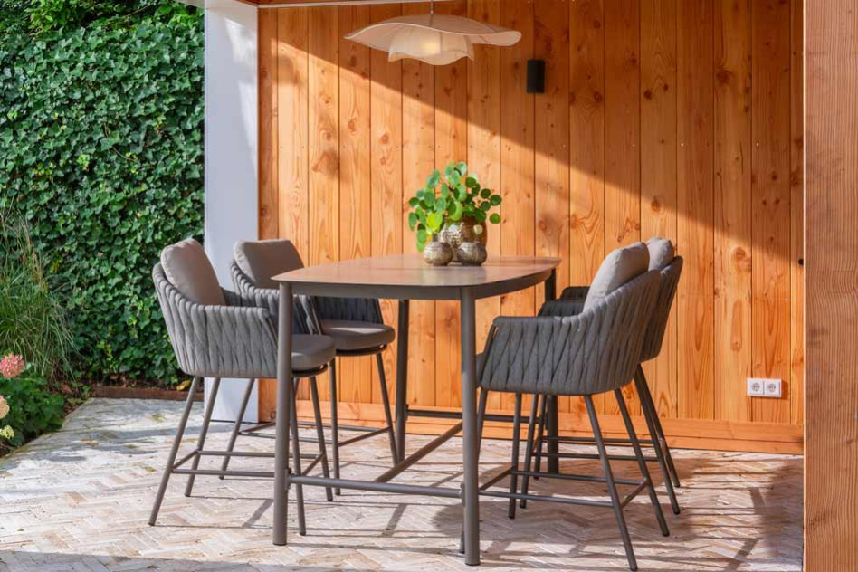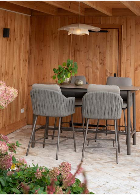 | Kurze Beschreibung | Der Cannes High-Dining Chair in warmem Terre-Ton bringt stilvollen Komfort auf Ihre Terrasse oder in den Garten. Der stabile Rahmen aus pulverbeschichtetem Aluminium ist mit handgeflochtenem Rope umhüllt, was dem Stuhl eine natürliche und luftige Ausstrahlung verleiht. Das dicke, wetterbeständige Polster sorgt für ein weiches und komfortables Sitzgefühl, ideal für lange Sommerabende oder gemütliche Runden an einem hohen Tisch. Dank der langlebigen Materialien bleibt der Stuhl Saison für Saison in Top-Zustand. Kombinieren Sie den Cannes High-Dining Chair mit einem unserer maßgefertigten Bartische für ein komplettes High-Dining-Erlebnis im Freien, bei dem Genuss und Entspannung Hand in Hand mit sommerlicher Atmosphäre gehen. |