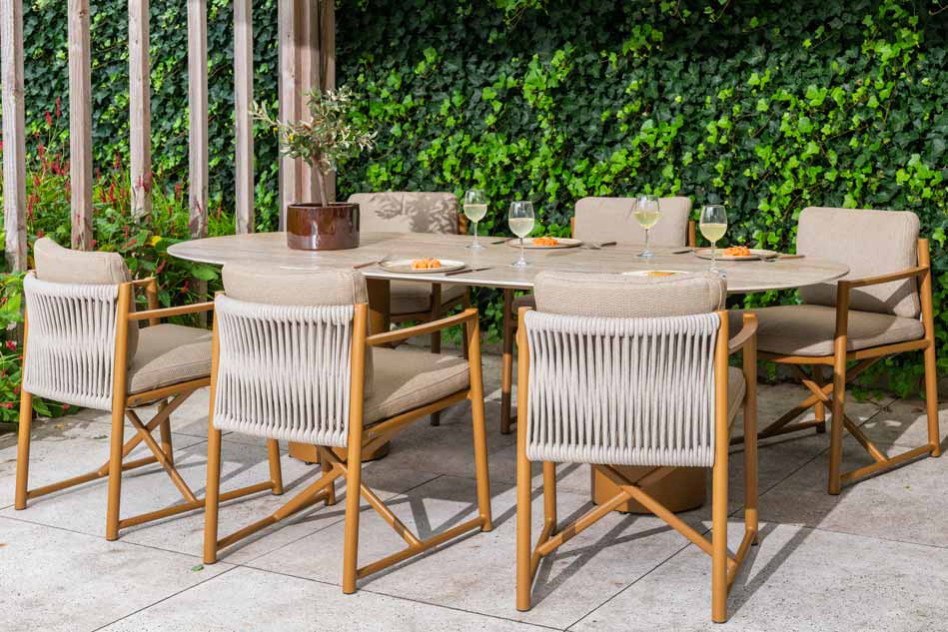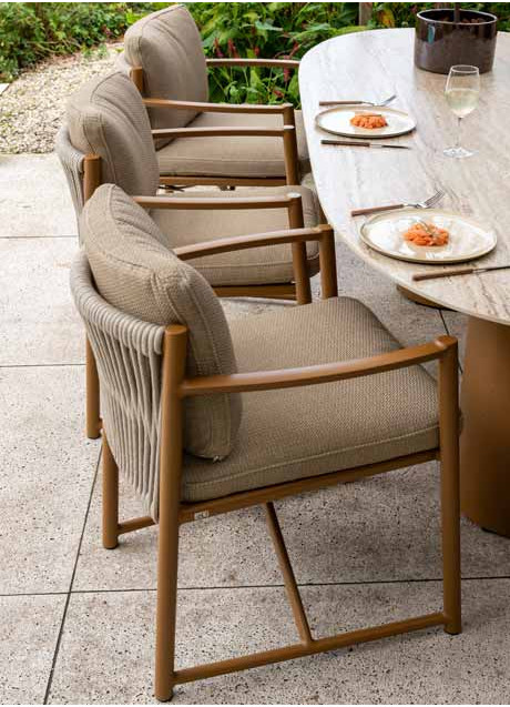 | Kurze Beschreibung | Der Marina Dining Chair ist die perfekte Kombination aus Stil, Komfort und Langlebigkeit. Das pulverbeschichtete Aluminiumgestell in einem warmen Amber-Erdton verleiht dem Stuhl ein modernes und elegantes Erscheinungsbild, während das dezente Rope-Geflecht in der Rückenlehne für eine luftige und luxuriöse Optik sorgt. Die wetterfesten Kissen aus hochwertigem Outdoor-Stoff bieten optimalen Sitzkomfort und sind zudem pflegeleicht und strapazierfähig. Dank der Verwendung langlebiger Materialien ist dieser Stuhl ideal für den dauerhaften Einsatz im Freien geeignet. |