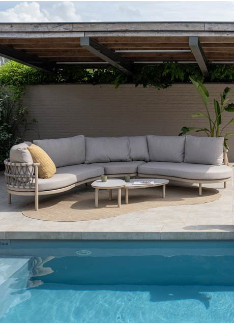 Piacenza latte 2 seater bench right arm and left open Das Piacenza Loungesofa in warmem Latte-Ton vereint stilvolles Design mit höchstem Komfort für Ihren Garten oder Ihre Terrasse. Dieses moderne Outdoor-Loungesofa besteht aus zwei Elementen, einem rechten Teil mit Armlehne und einer linken Chaise Longue, ideal, um sich in der Sonne zu entspannen. Der pulverbeschichtete Aluminiumrahmen ist robust, pflegeleicht und mit hochwertigem Rope umhüllt, was dem Sofa eine luftige und natürliche Ausstrahlung verleiht. Die dicken, wetterbeständigen Kissen sorgen Saison für Saison für langanhaltenden Sitzkomfort. Perfekt kombinierbar mit unseren maßgefertigten Couchtischen für ein vollständiges Loungeset. Möchten Sie noch mehr Platz schaffen? Ergänzen Sie einfach das Piacenza XL Corner Element und gestalten Sie Ihre ideale Ecklounge. Piacenza latte XL corner Der Piacenza XL Corner in warmem Latte-Ton ist das ideale Lounge-Element, um Ihr Garten-Set zu vervollständigen. Mit diesem Eckelement lässt sich das Piacenza Loungesofa ganz einfach zu einer großzügigen und einladenden Eck-Lounge kombinieren, perfekt für entspannte Sommertage und stimmungsvolle Abende im Freien. Der stabile, pulverbeschichtete Aluminiumrahmen ist mit hochwertigem Rope umhüllt, was dem Element eine luftige und moderne Ausstrahlung verleiht. Die bequemen, wetterbeständigen Kissen bieten optimalen Sitzkomfort und sind resistent gegen Sonne und Regen. Dank der langlebigen Materialien bleibt der Piacenza XL Corner Saison für Saison schön. Kombinieren Sie dieses Eckelement mit dem passenden Piacenza Loungesofa und einem maßgefertigten Couchtisch, um eine harmonische und stilvolle Outdoor-Lounge zu schaffen. Volta natural teak coffee table central leg Latte 60 x 35 cm Der Volta Couchtisch ist die perfekte Ergänzung für dein Loungeset. Mit einem stabilen, beschichteten Edelstahlrahmen und einer echten Teakholzplatte bringt dieser Beistelltisch eine natürliche Ausstrahlung in deinen Außenbereich. Das klare Design mit einem zentralen Fuß sorgt für einen modernen Look und bietet gleichzeitig Stabilität. Der Durchmesser von 60 cm und die Höhe von 35 cm machen ihn zu einer vielseitigen Wahl für jede Lounge-Ecke. Kombiniere diesen Tisch mühelos mit anderen Loungemöbeln und schaffe eine einladende Atmosphäre auf deiner Terrasse. Der Volta Couchtisch ist nicht nur praktisch, sondern auch eine stilvolle Ergänzung für deinen Garten oder Balkon. |